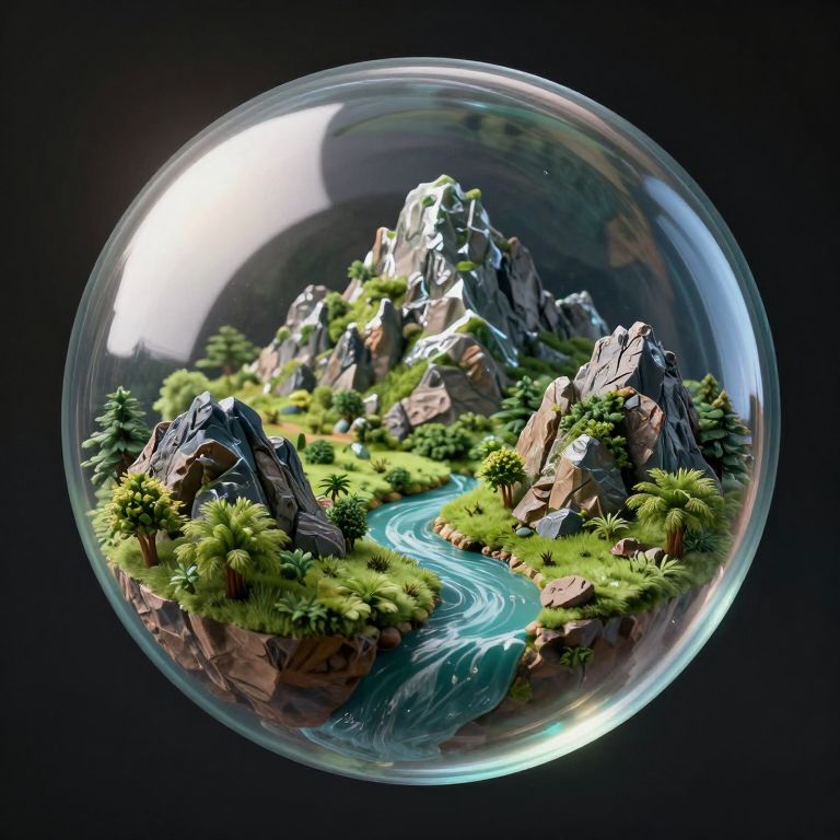 A surreal 3D-rendered scene depicts a miniature ecosystem encased within a transparent bubble, featuring floating mountains, lush greenery, and a serene river, all bathed in ethereal lighting that highlights the intricate details of this micro-universe.