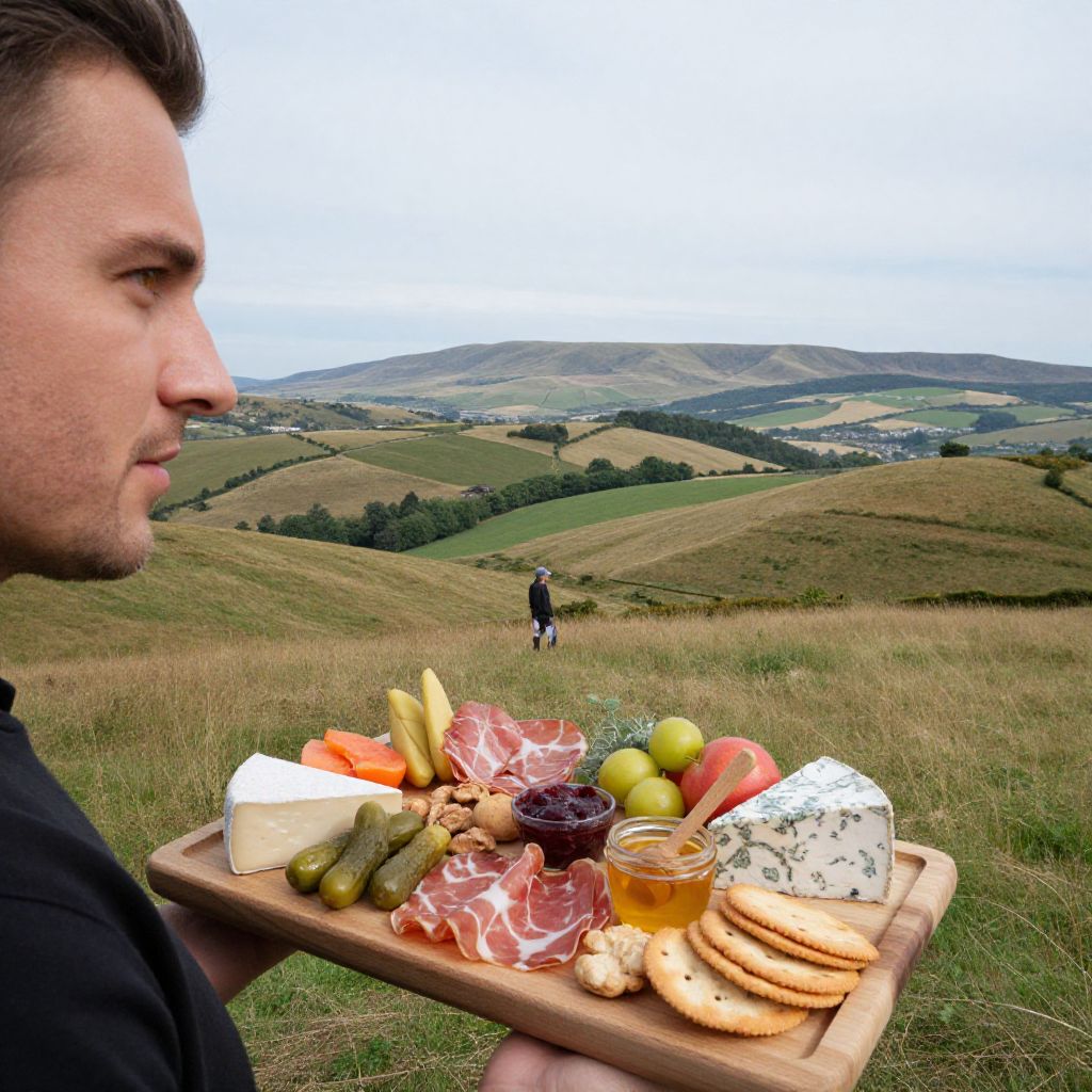 Photograph of a man in profile, holding a wooden tray with a variety of cheeses, including a blue cheese, a white cheese, and a round cheese, accompanied by sliced meats, bananas, green grapes, a small glass of honey, and crackers, against a backdrop of rolling green hills under a cloudy sky. Another person is walking in the distance. The man has short brown hair and wears a black shirt. The image is vibrant with rich colors and a slightly exaggerated, almost surreal, photographic style.
