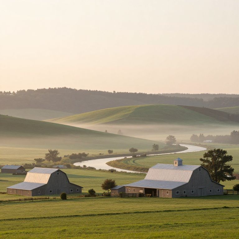 Smithfield-Selma, serene rural landscape on the outskirts with rolling hills, peaceful farm fields, quaint barns, a winding river, and early morning mist, soft pastel colors, photorealistic rendering.