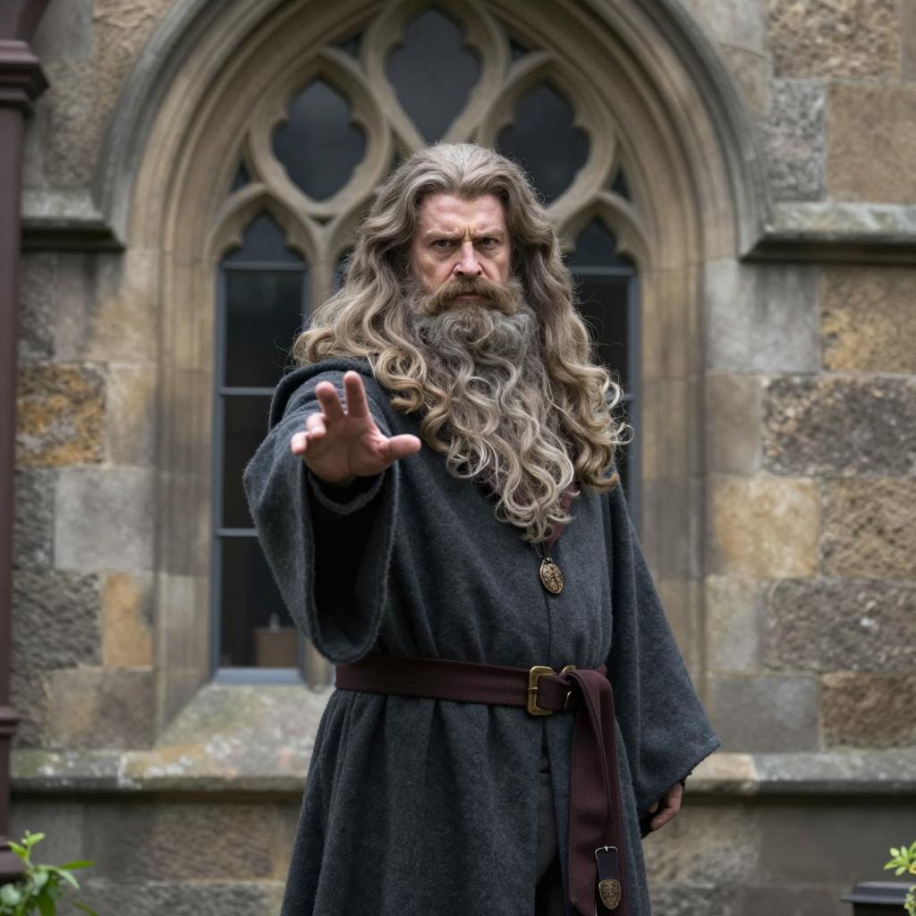 Renaissance faire wizard, photo of older man with grey beard, intense blue eyes, wearing a red and brown hooded cloak, black tunic with white ruffled shirt underneath, brown braided hair, realistic, close-up, outdoors, slightly blurred background, natural light, actor in period costume, movie still, detailed ures, realistic skin tones, deep wrinkles, serious expression, background includes greenery and wooden structures, realistic style, high quality