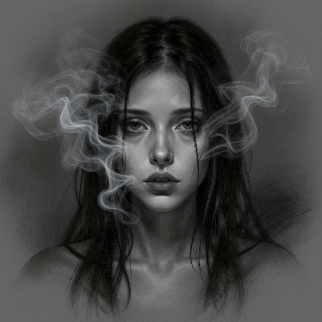 A hauntingly detailed digital illustration captures a somber portrait of a woman with dark, wet hair, her face framed by ethereal smoke, evoking the eerie essence of a ghostly charcoal sketch that whispers the subject's innermost thoughts.