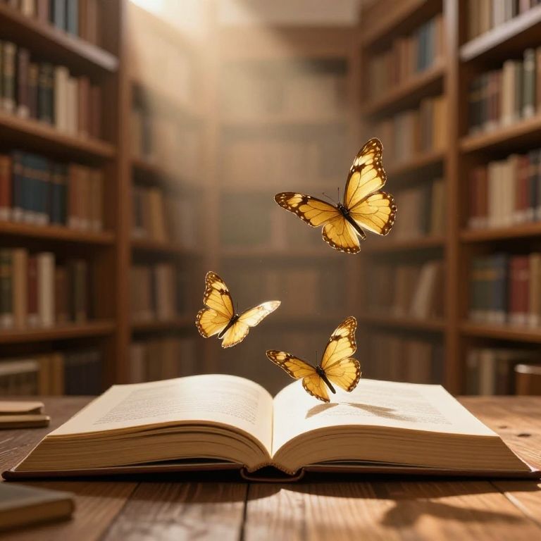 Golden butterflies flutter gracefully above an open book, surrounded by towering wooden shelves filled with countless volumes, as sunlight filters through the scene, casting a warm, ethereal glow.