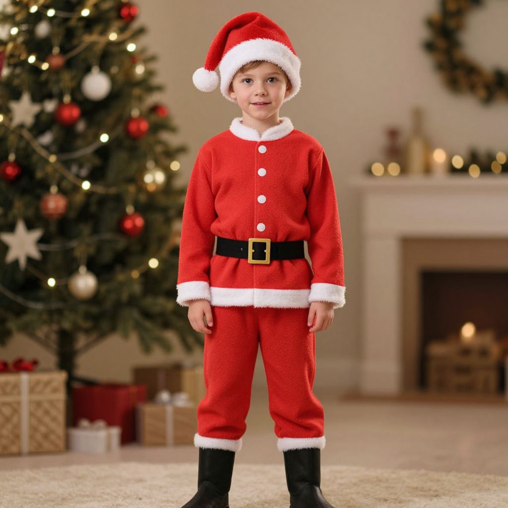 Photograph of a young boy in a red Santa outfit with white trim and black belt, standing in a Christmas-decorated living room.
