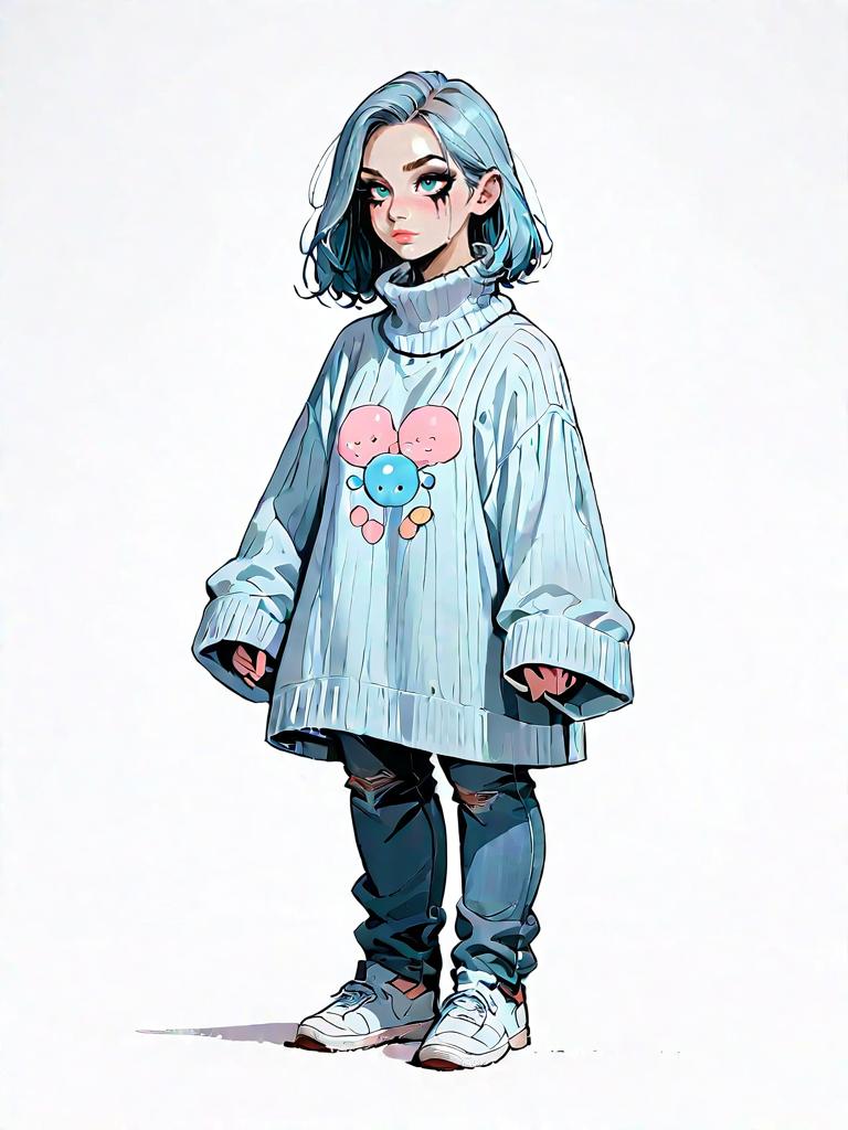 1girl, source_comics, realistic face, full body shot, Woman, casual comfort, oversized knit sweater in beige with ribbed turtleneck, dropped shoulders, wide long sleeves, light blue relaxed-fit jeans, white sneakers, minimal makeup, simple hairstyle, plain white background