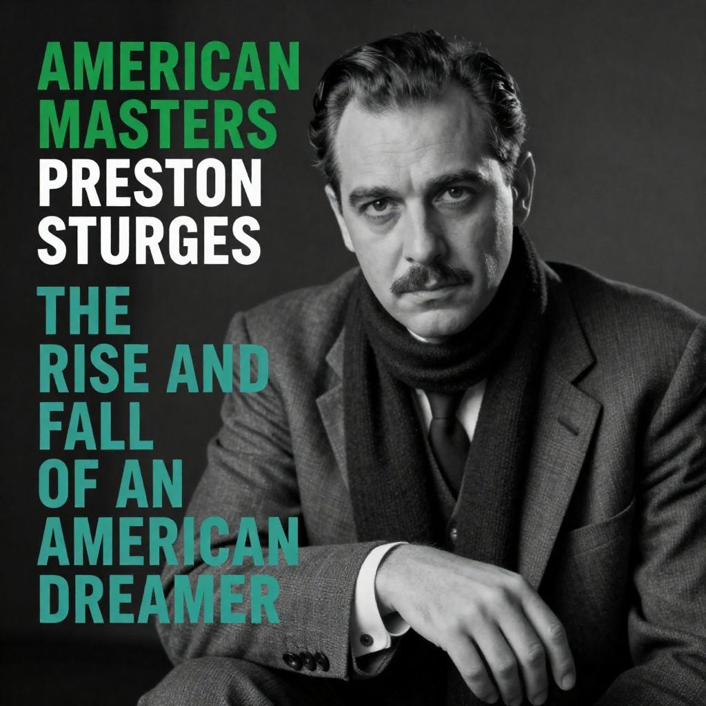 Black-and-white photograph of a serious-looking man in a suit with a dark scarf, seated, right arm resting on his knee. Background is dark. Text "AMERICAN MASTERS" in green, "PRESTON STURGES" in white, "THE RISE AND FALL OF AN AMERICAN DREAMER" in teal. Man has short, slicked-back hair, mustache, and intense gaze.