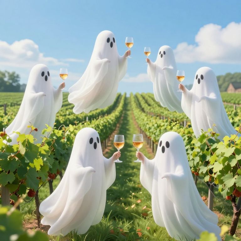 In a whimsical digital art rendering, ethereal ghosts float serenely above a meticulously arranged vineyard, each holding glasses of amber-hued wine, as if partaking in a celestial toast amidst the vibrant greenery and serene blue sky.