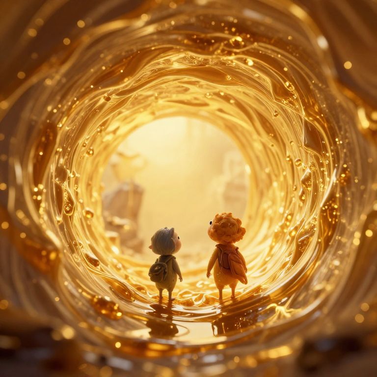 In a surreal world where gravity dissolves into liquid gold, two small creatures navigate a luminous honey tunnel, their journey embodying the delicate balance between exploration and vulnerability, illuminated by the promise of discovery and the warmth of shared adventure.