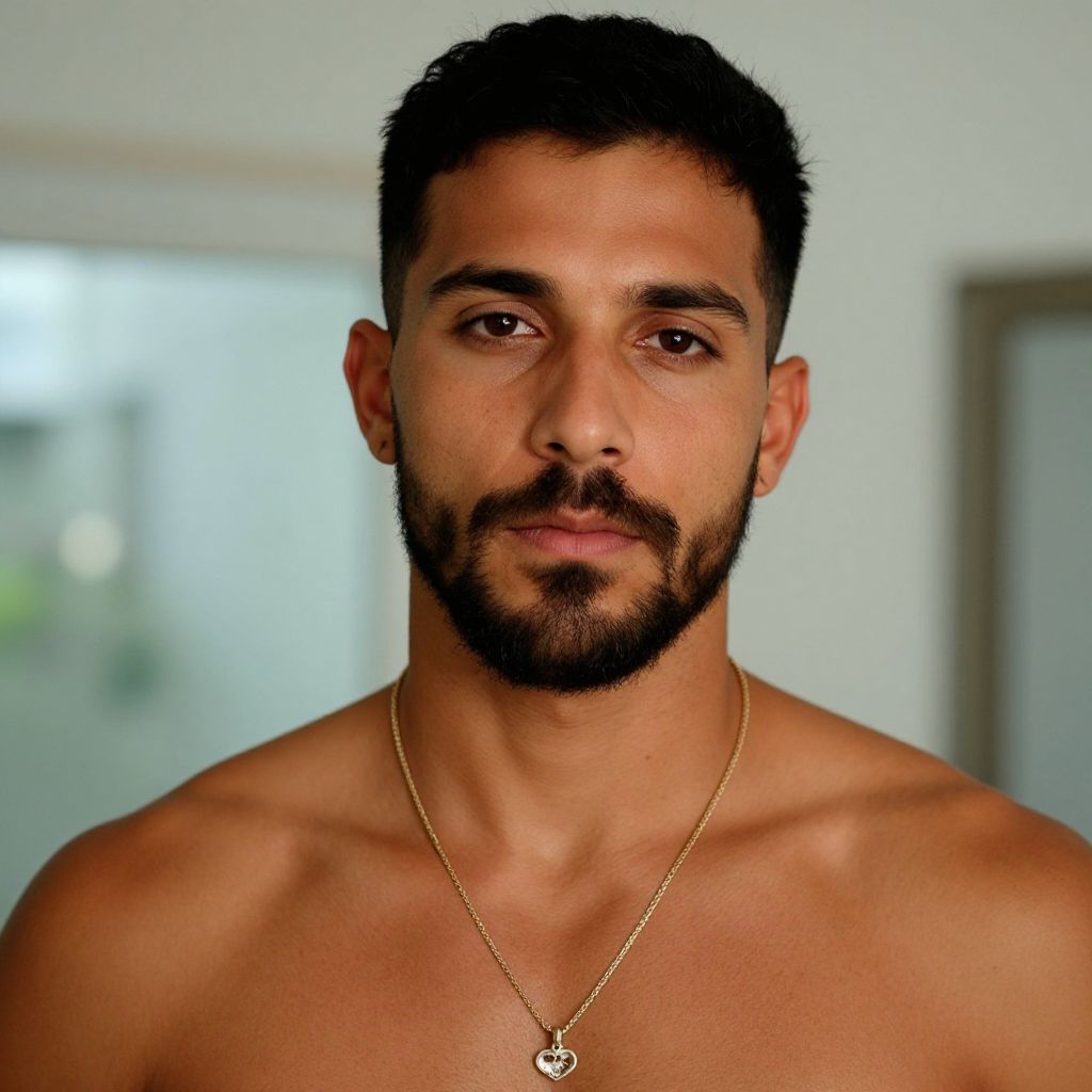 "man clothes caribbean, 1boy, male focus, solo, facial hair, beard, looking at viewer, black hair, necklace, jewelry, mustache, realistic, short hair Realistic photo of casual sexy person with pretty face"