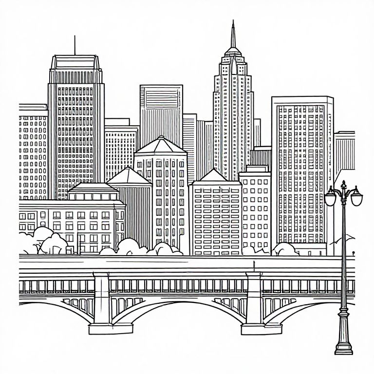 Coloring stencil featuring urban cityscape elements like buildings, bridges, and street lamps, simplified yet detailed for artistic coloring, combining architectural precision with creative freedom.
