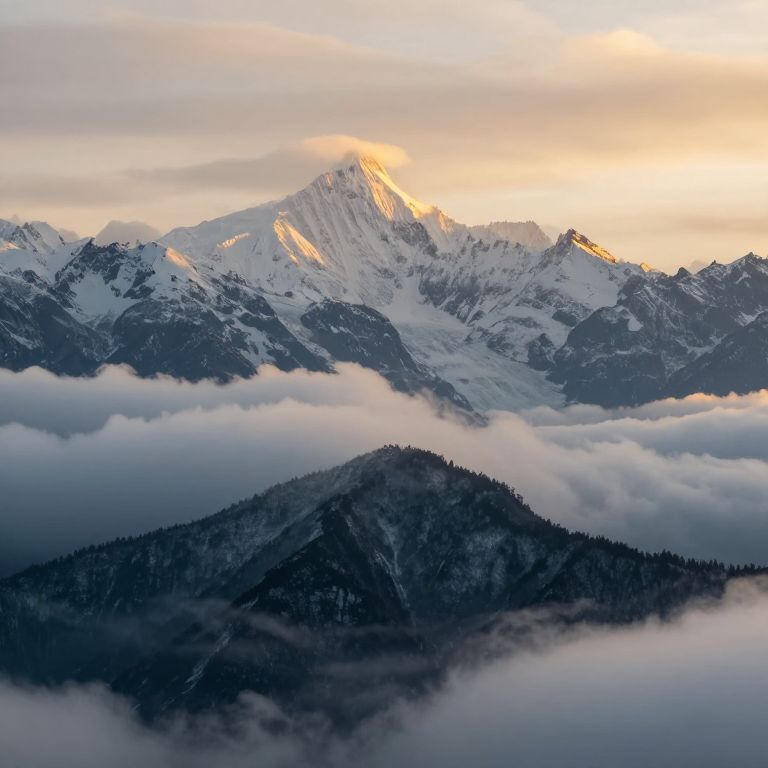 A majestic, snow-capped mountain range emerges triumphantly above a sea of ethereal clouds, its peaks bathed in golden light as if sculpted by the whims of a celestial artist.