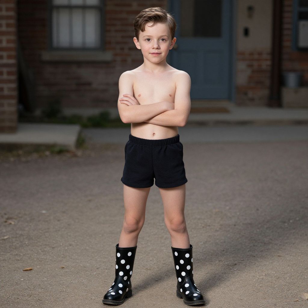 Photograph of a young, white boy with short brown hair, shirtless, wearing black shorts, polka dot socks, and black shoes, standing