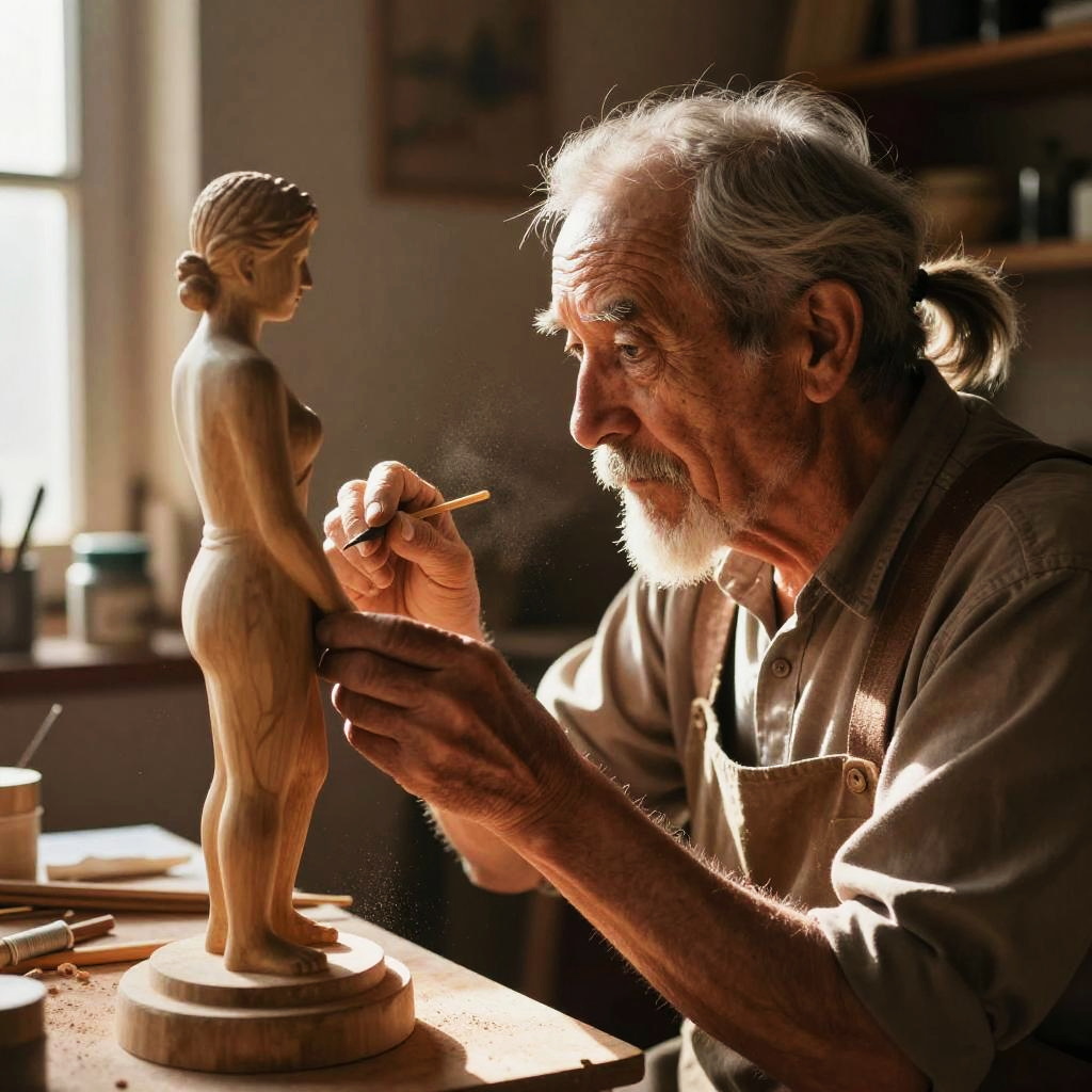 Old man with ponytail sculpting a wooden statue in a cozy workshop, dust particles in the sunlight, detailed wood grain, concentration on face, warm earthy tones