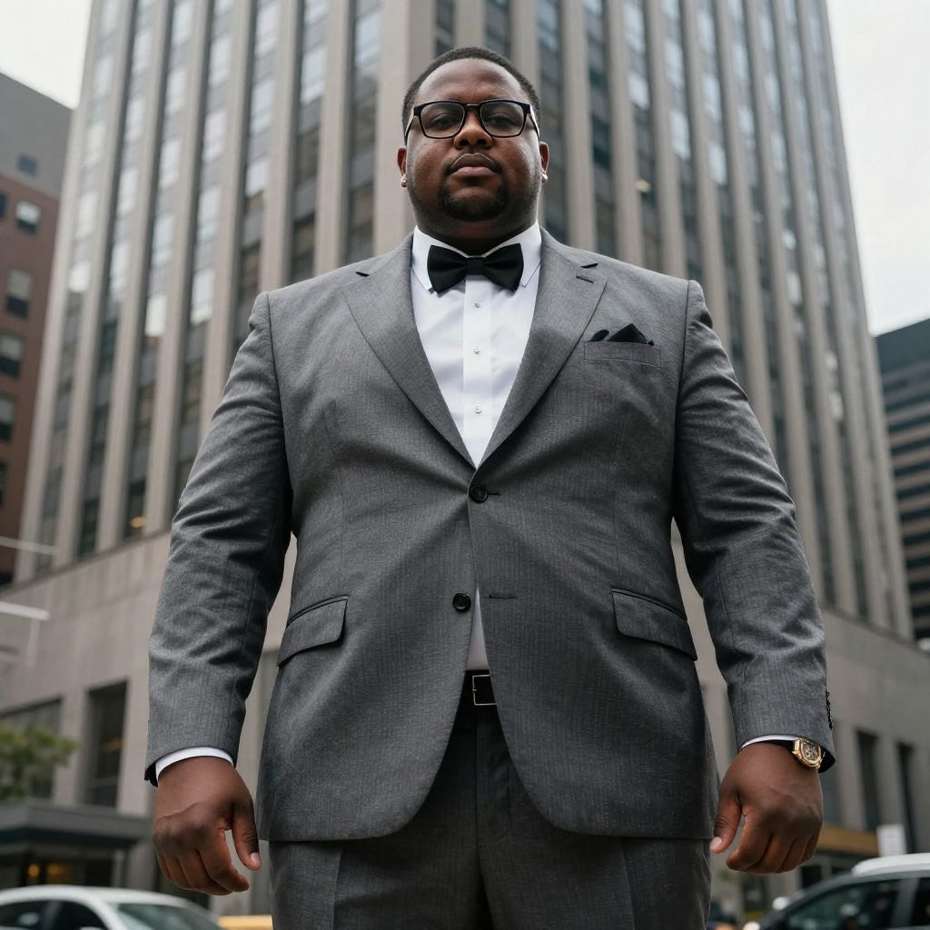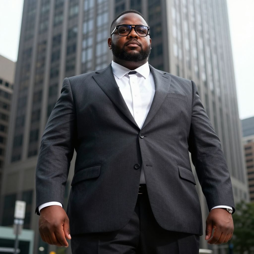 Fat black guy with glasses wearing a stylish suit, standing confidently in front of a skyscraper, strong urban style, dramatic lighting, photorealistic and sharp focus