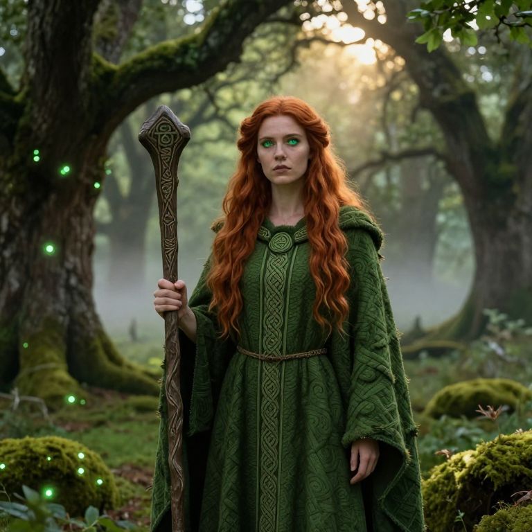Photorealistic digital art of a red-haired woman with green eyes, wearing a green, intricately patterned cloak, holding a Celtic staff, in