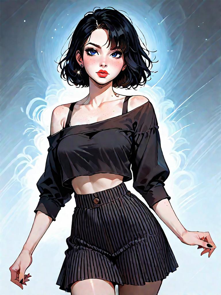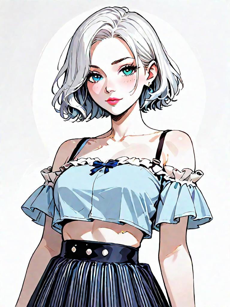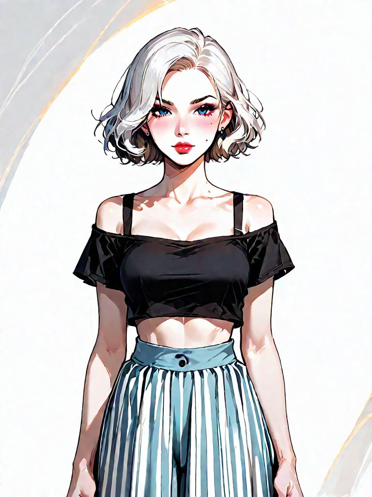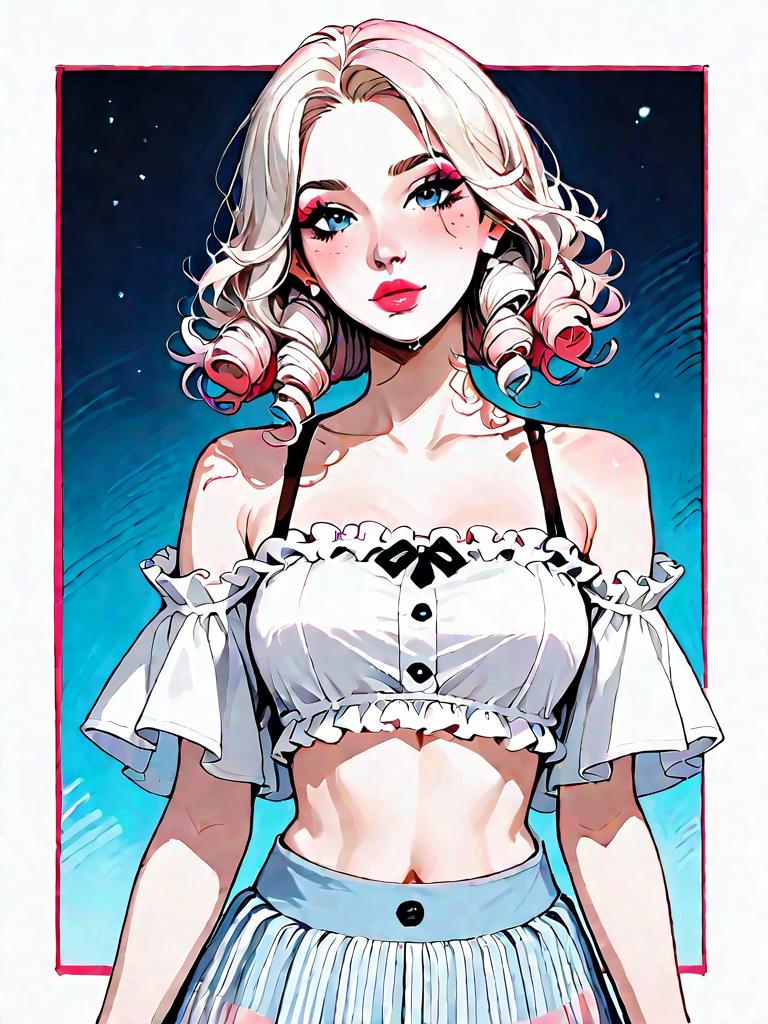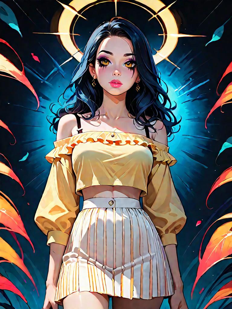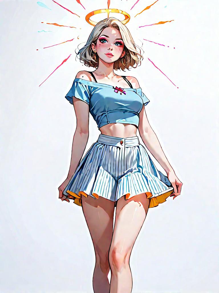 Digital artwork of a young woman with short blonde hair and minimal makeup, wearing an off-the-shoulder light blue crop top and a high-waisted pleated skirt with vertical stripes. She stands confidently with a slight hip pop against a cream-colored background, featuring a radiant halo effect above her head. The image emphasizes trendy night-out fashion and soft, diffused lighting.