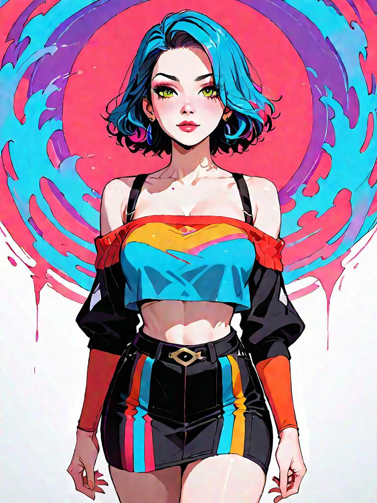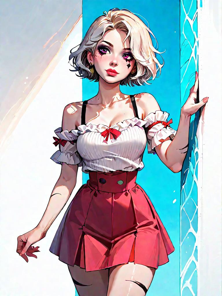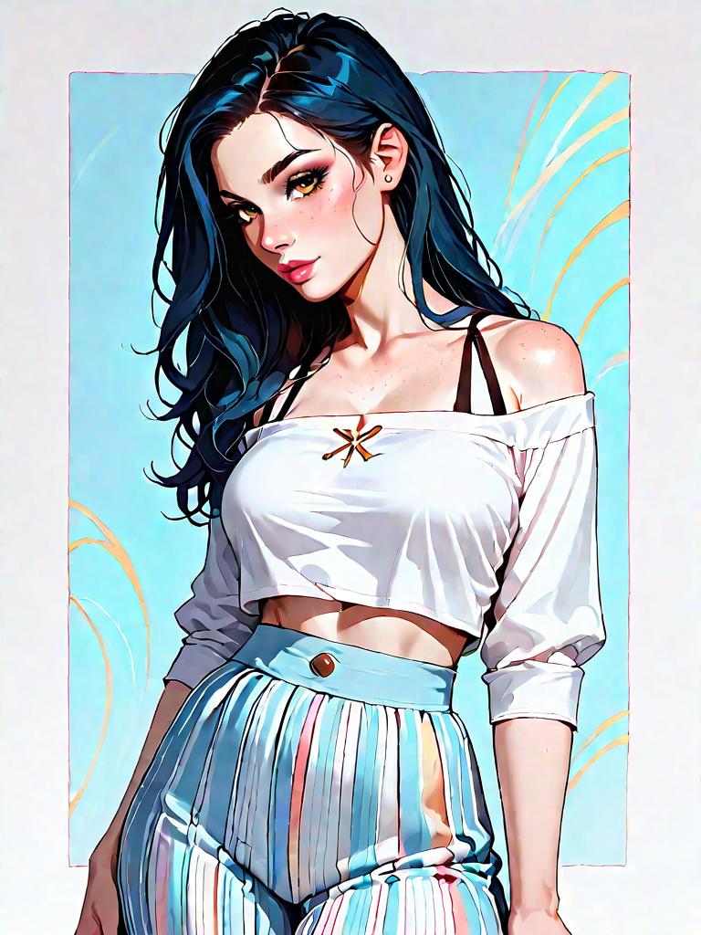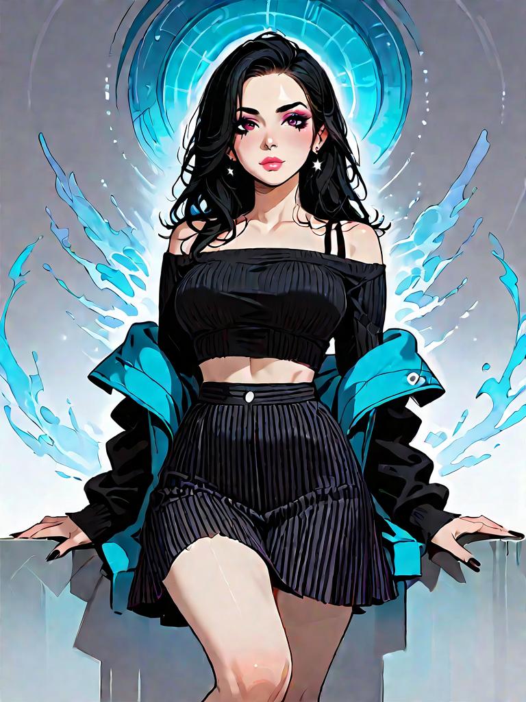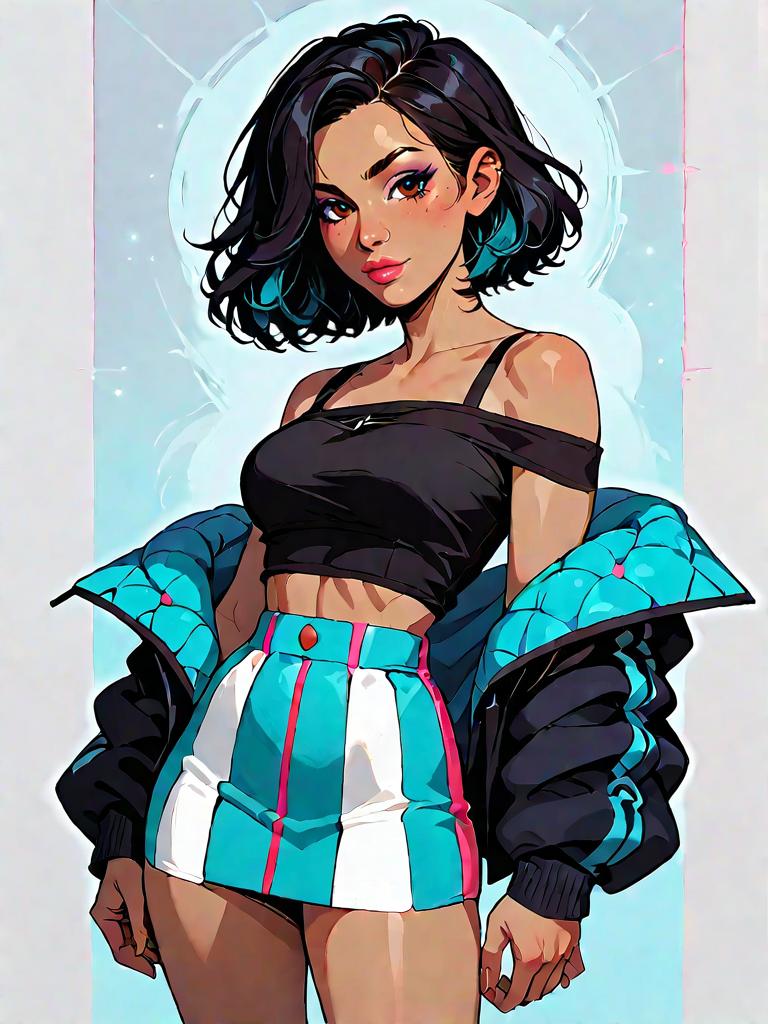 Digital artwork of a young woman with short blonde hair and minimal makeup, wearing an off-the-shoulder light blue crop top and a high-waisted pleated skirt with vertical stripes. She stands confidently with a slight hip pop against a cream-colored background, featuring a radiant halo effect above her head. The image emphasizes trendy night-out fashion and soft, diffused lighting.