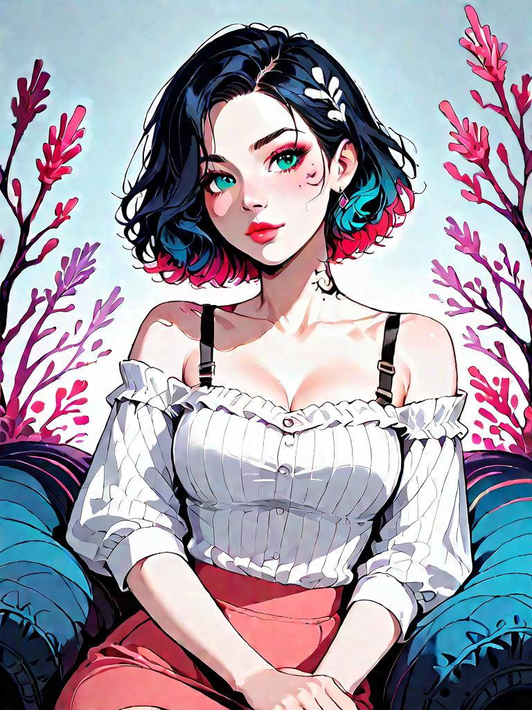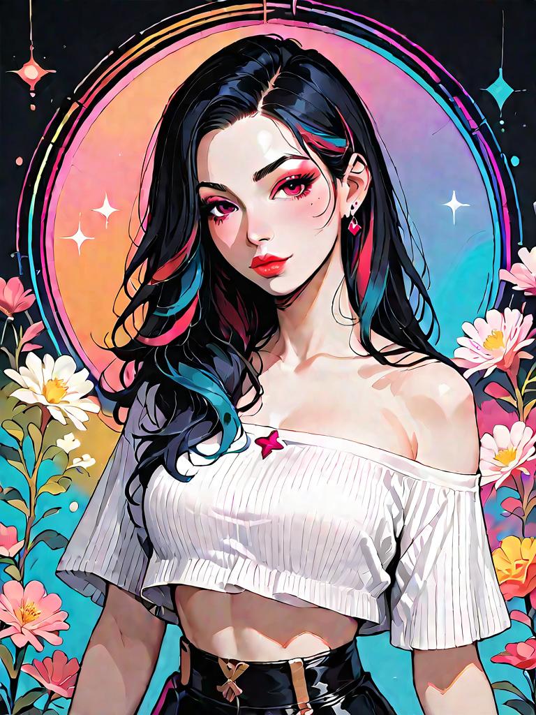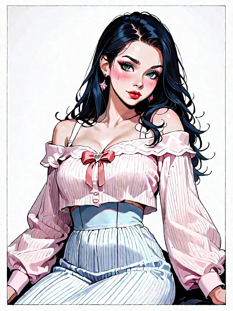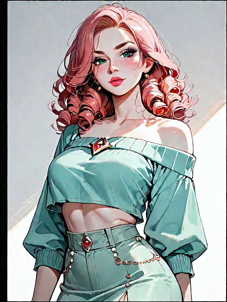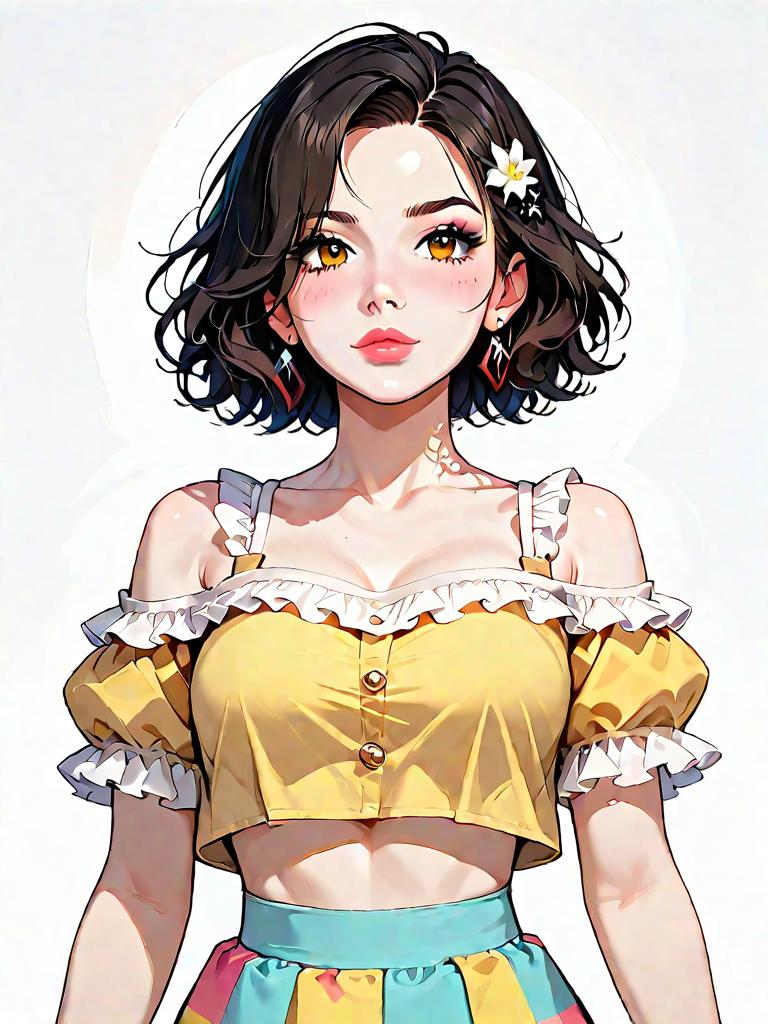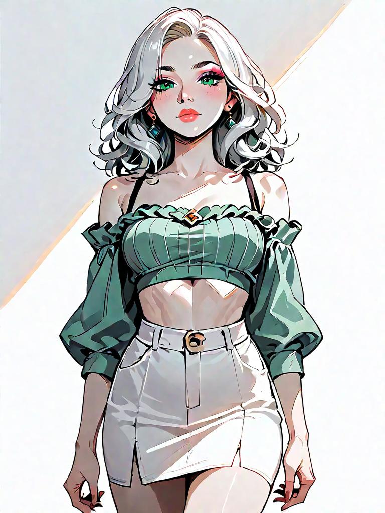 Digital artwork of a young woman with short blonde hair and minimal makeup, wearing an off-the-shoulder light blue crop top and a high-waisted pleated skirt with vertical stripes. She stands confidently with a slight hip pop against a cream-colored background, featuring a radiant halo effect above her head. The image emphasizes trendy night-out fashion and soft, diffused lighting.