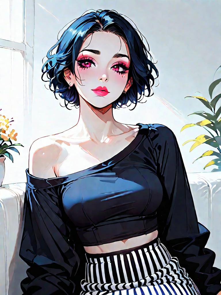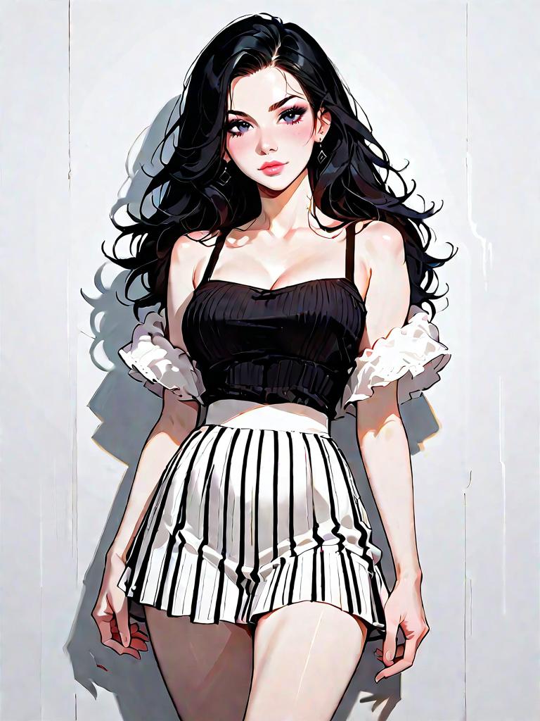 1girl, woman wearing off-the-shoulder ruffled ribbed crop top and high-waisted vertical stripe midi pencil skirt with front slit in electric blue top with black-and-white striped skirt on petite woman with soft waves and minimal makeup posed standing with both arms relaxed and one hip slightly popped in cream-colored wall reminiscent of indoor party setting, diffused light that still leaves slight shadow halo, trendy night-out fashion photography, high resolution, ultra-detailed