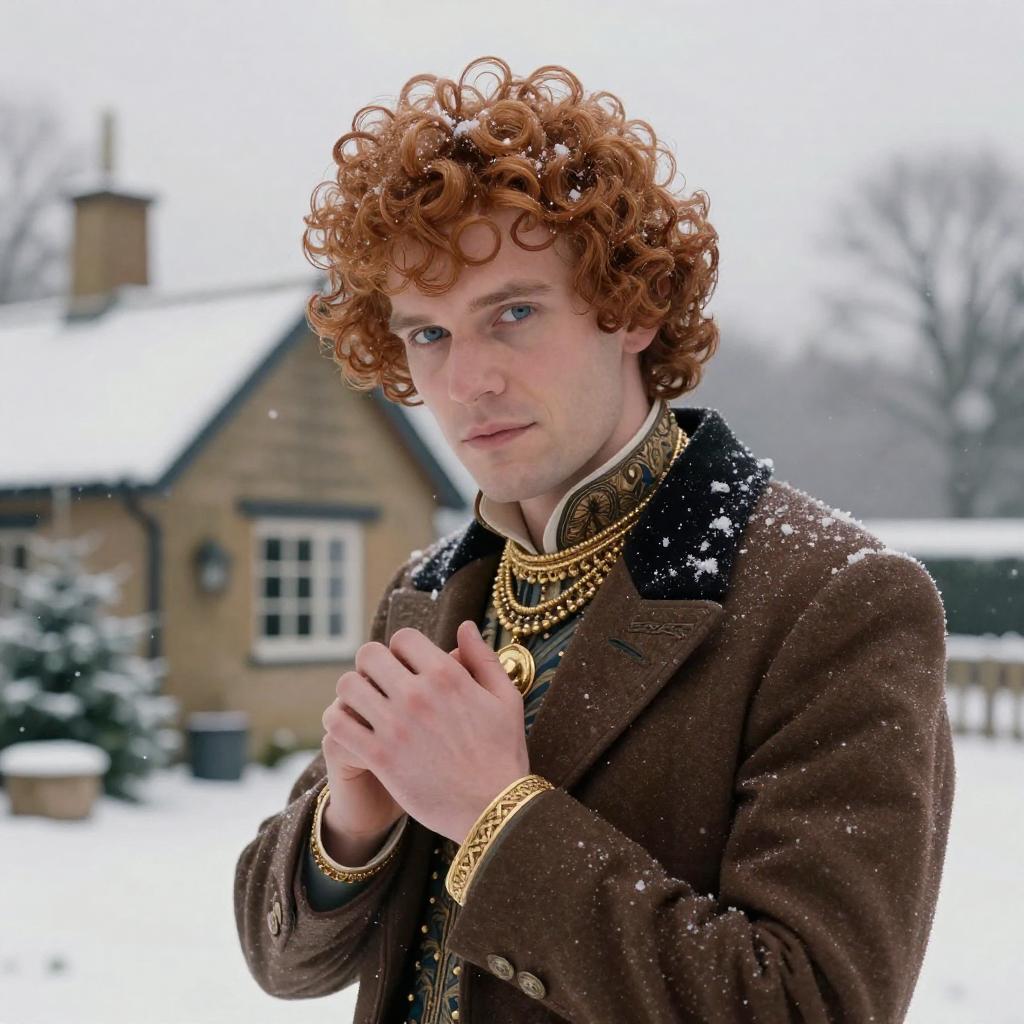 A beautiful festive cabin in the English countryside on Christmas Eve during a snowstorm, inkpunk768, f/1.4, square image, close up film photo, portrait of a Mister, auburn afro, blue eyes, gold jewelry, elegant pose, atmospheric lighting, cinematic composition, detailed, autumn, filmgenre__