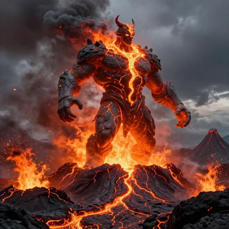 A colossal figure sculpted from molten lava stands amid erupting volcanoes, with fiery orange cracks glowing throughout its body. The intense dynamic scene features ash and smoke under a stormy sky, conveying immense power and high fantasy concept art.