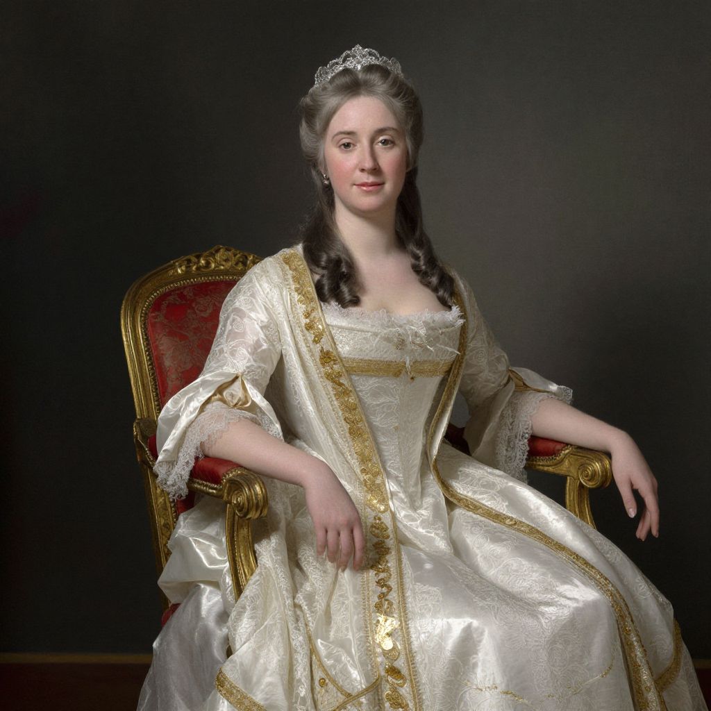 Photograph of a Caucasian woman with pale skin and dark brown, wavy hair, seated on an ornate red and gold throne. She wears an elegant, white, satin gown with gold embroidery and lace, adorned with a silver tiara. Her gown has puffed sleeves and a square neckline, exposing her modest cleavage. She sits with a composed expression, her right hand resting on the armrest. The background is dark, highlighting her regal attire and the luxurious chair. The image exudes an 18th-century European aristocratic style.