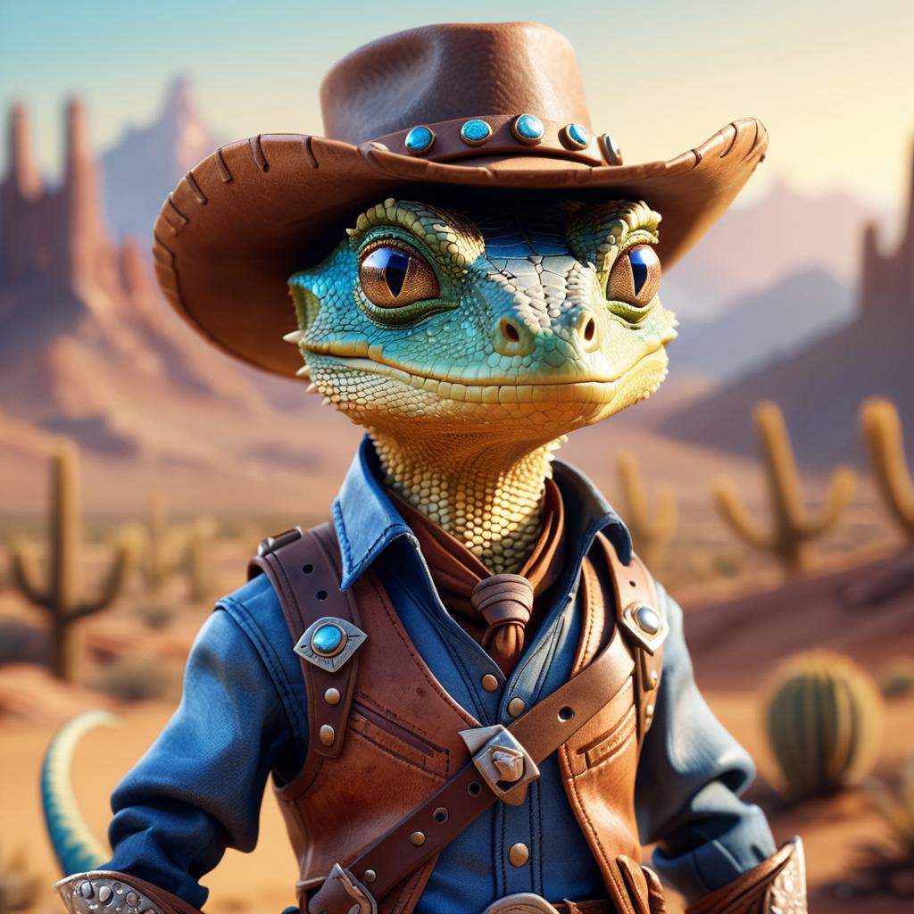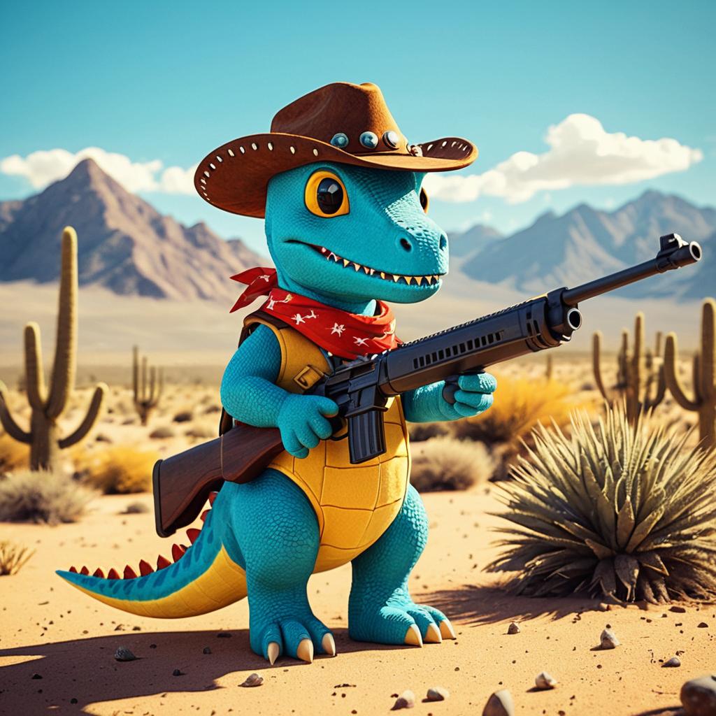 A cute blue and yellow cartoon-style small dinosaur wearing a brown cowboy hat and red neckerchief, holding a large black rifle, standing in a sunlit desert landscape with mountains in the background, warm orange and blue tones, stylized realistic rendering, bright turquoise and yellow color
