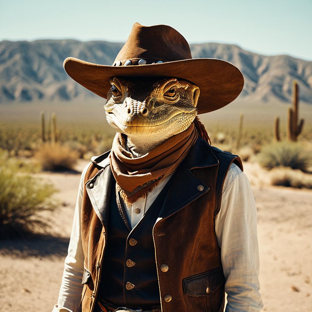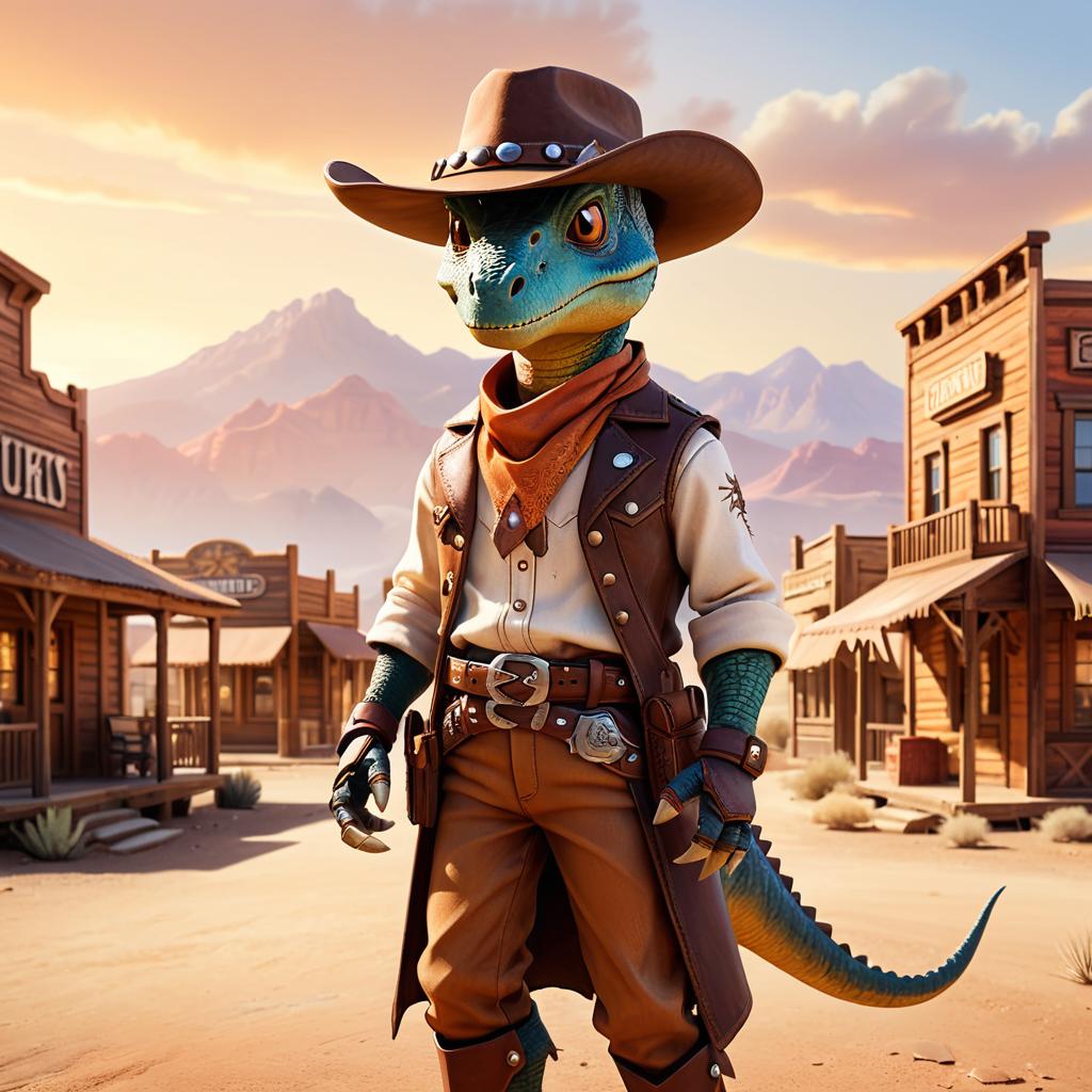 Cartoon Dinosaur Cowboy with Rifle in Desert