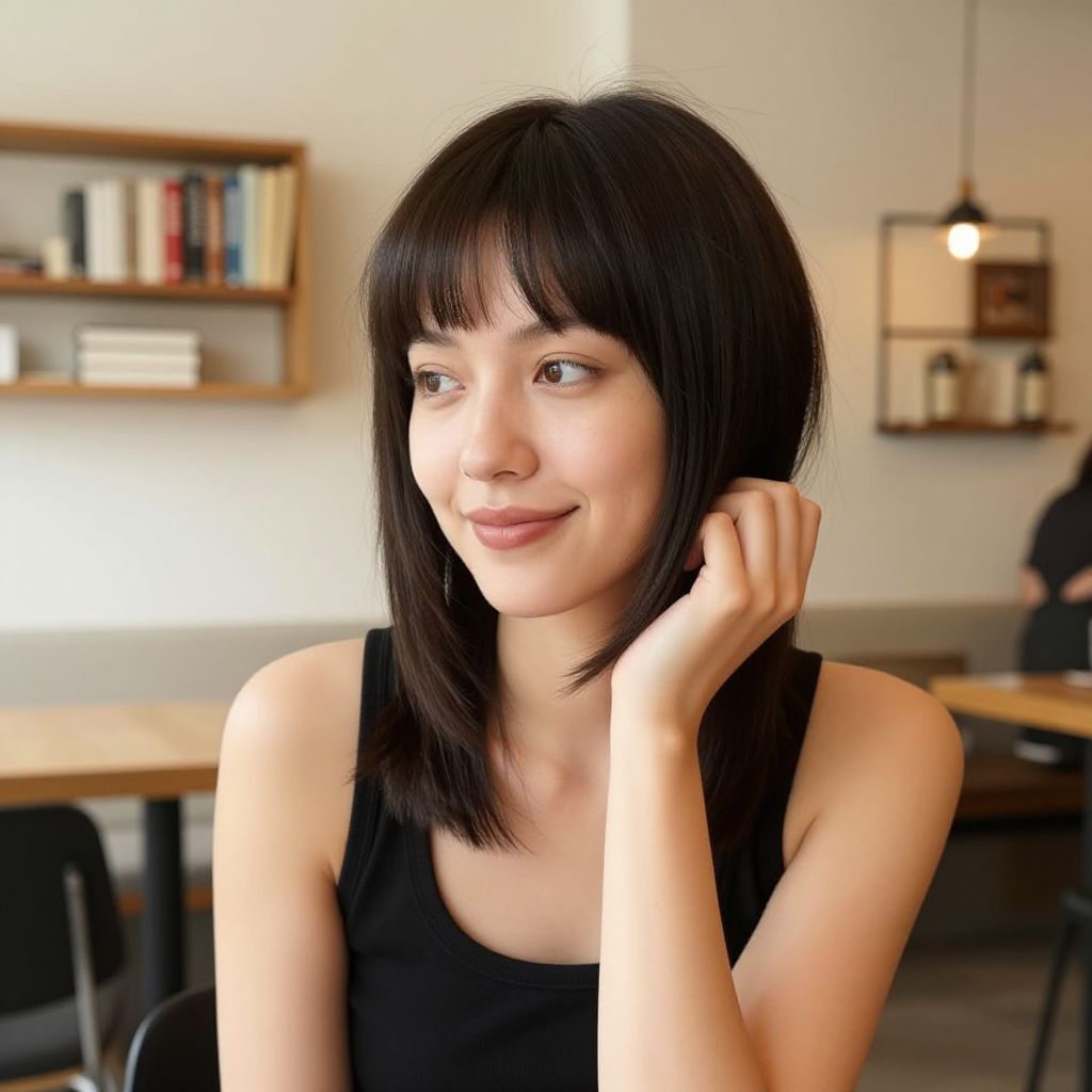 Woman with sleek, high-pitched cut hairstyle at a stylish café, surrounded by books and minimalist decor, natural lighting, warm tones, expressive smile, elegant and fresh, medium composition, realistic skin and hair detail, Dall-E style