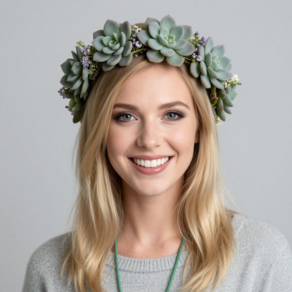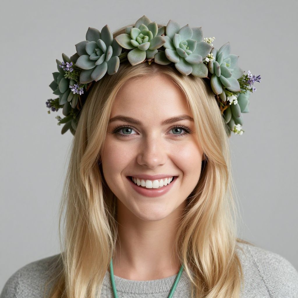 Photograph of a smiling young woman with fair skin and blue eyes, wearing a green and gray succulent flower crown. She has long, straight blonde hair and is dressed in a light gray, textured sweater. The background is a plain, light gray, which contrasts with the vibrant green of the succulents. The succulent crown features multiple rosettes and small purple flowers, adding a natural, bohemian touch to her appearance. The image is sharply focused, highlighting the details of the succulent crown and her joyful expression.