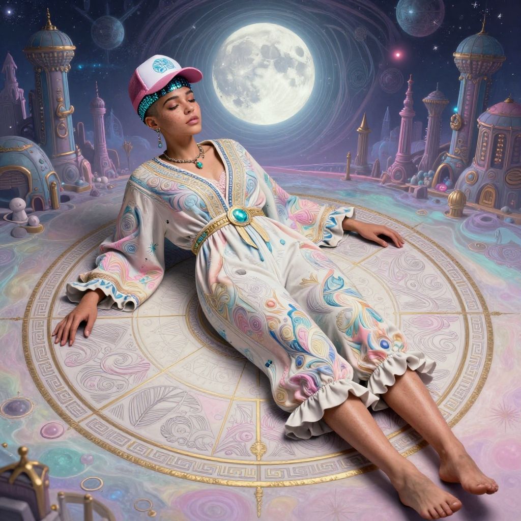 1girl, grand Intaglio Print of a Golden ratio, Royalcore Insensitive hefty [Modern:Macanese:2] (Female [Tiefling|Tinker Bell]:1.3), she is Space skin, she is feeling very grateful, she is Laying at a Copenhagen, dressed in a very Warlike [Djellaba|Capri pants], The Cropped pants is ruffled, her hair is Zulu and styled as Buzz cut with a fade, she has a Eclectic Disco Era Lazuli Tiara, Trucker hat, [Micronesian:Japanese:16] dungeon and Lunar eclipse in background, Moon in the night, horizon-centered, (stylized by Viktor Vasnetsov:0.9), (Samson Pollem:0.8), (Mary Heilmann:0.7), Ultrarealistic, Depressing, award winning, Grungepunk, split lighting, pinhole lens, Pastel Colors, dreamy, League of Legends Splash Art, skin pores, freckles, most beautiful artwork in the world, High quality, psychedelic, D&D, sci fi