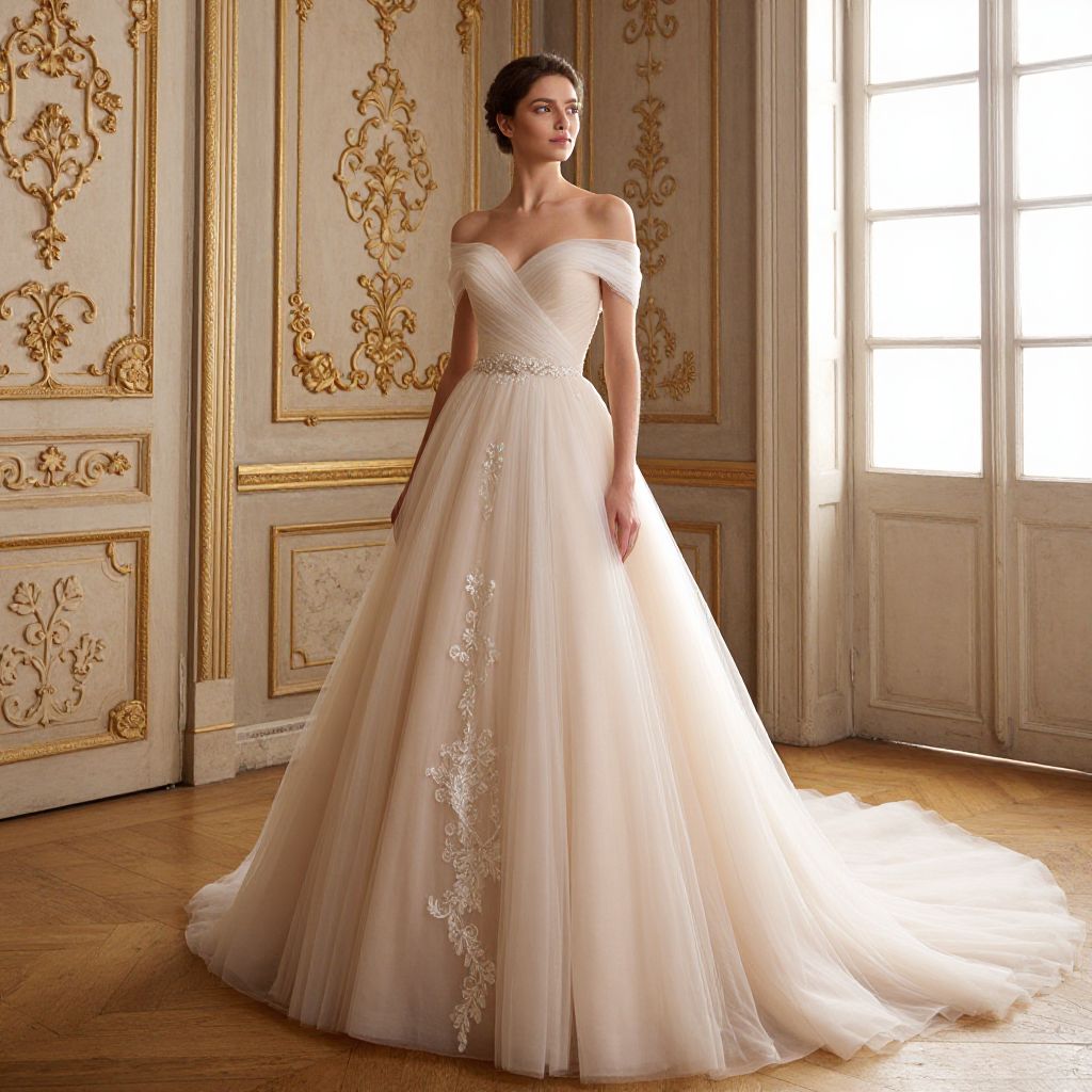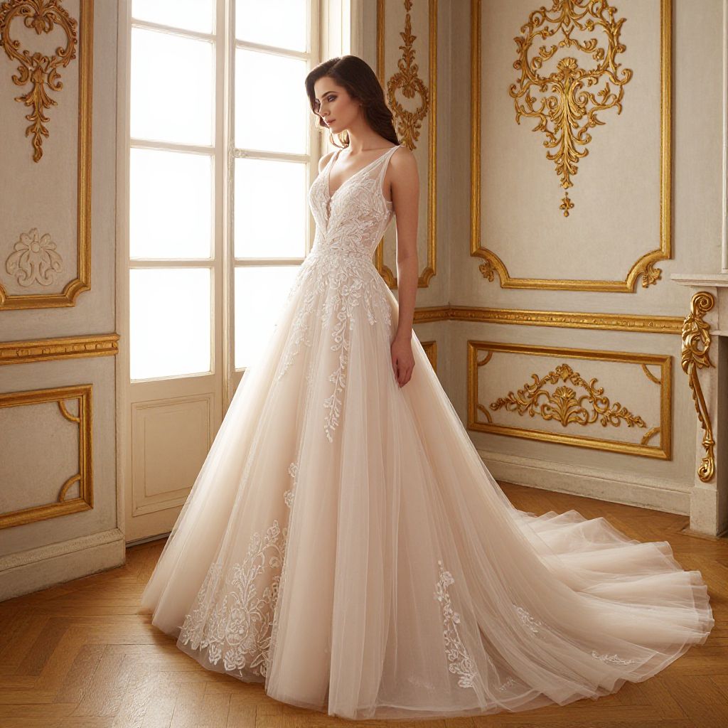 Blush tulle wedding gown elegantly draped on a woman standing gracefully in a vintage-style room, featuring ornate gold accents, intricate wall patterns, and a large window with natural light streaming through.