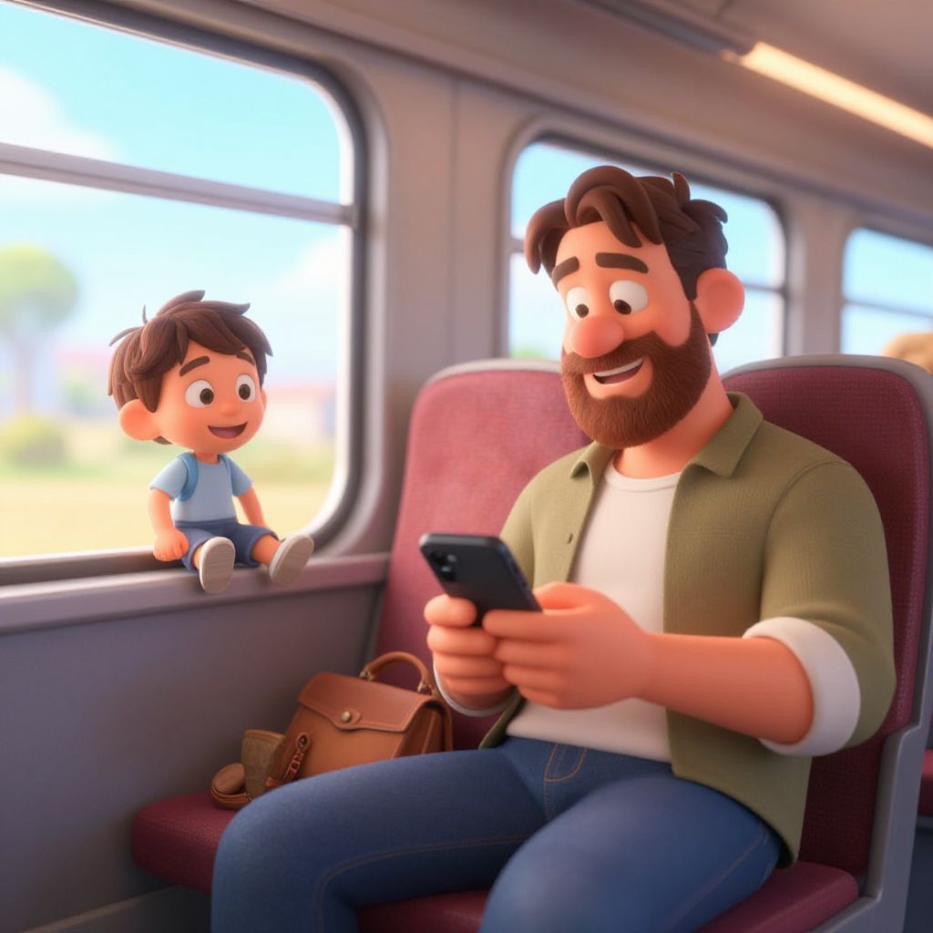 This is a vibrant, digital 3D cartoon-style image depicting a bearded man with a medium build and brown hair, sitting in a train car. He is wearing a green, button-up shirt over a white t-shirt and blue jeans, and is smiling while looking at a smartphone. Next to him, a small, smiling cartoon boy with brown hair and a blue shirt sits on the window ledge, holding a small object. A brown handbag is placed on the seat beside the man. The background shows large, sunlit windows with blurred greenery outside. The interior has purple seats and soft lighting.