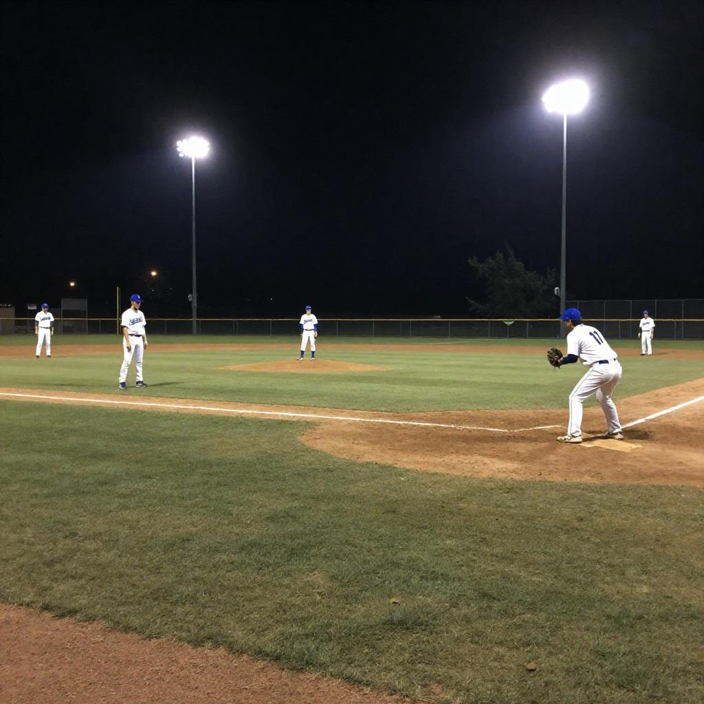 Nighttime Baseball Game on Grass Field
