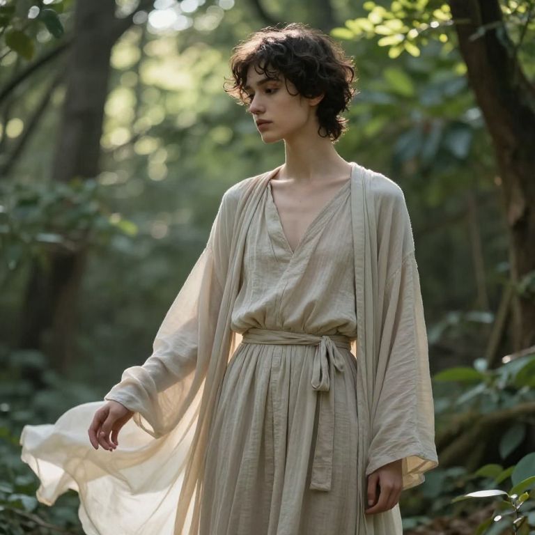 Androgynous beauty standing in a natural forest, gentle sunlight filters through leaves, flowing neutral-toned garments, serene expression blending masculinity and femininity