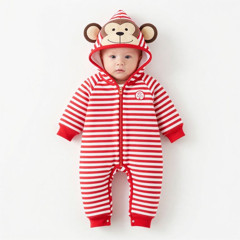 Photograph of a baby in a red and white striped onesie with a monkey hood, standing against a white background.