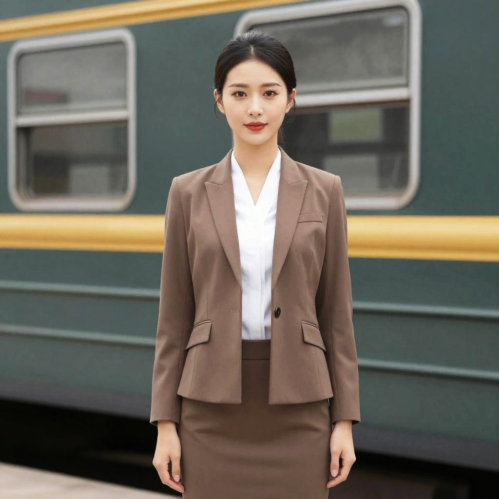 Work Attire Woman Costume, woman in brown jacket and white shirt standing in front of a train