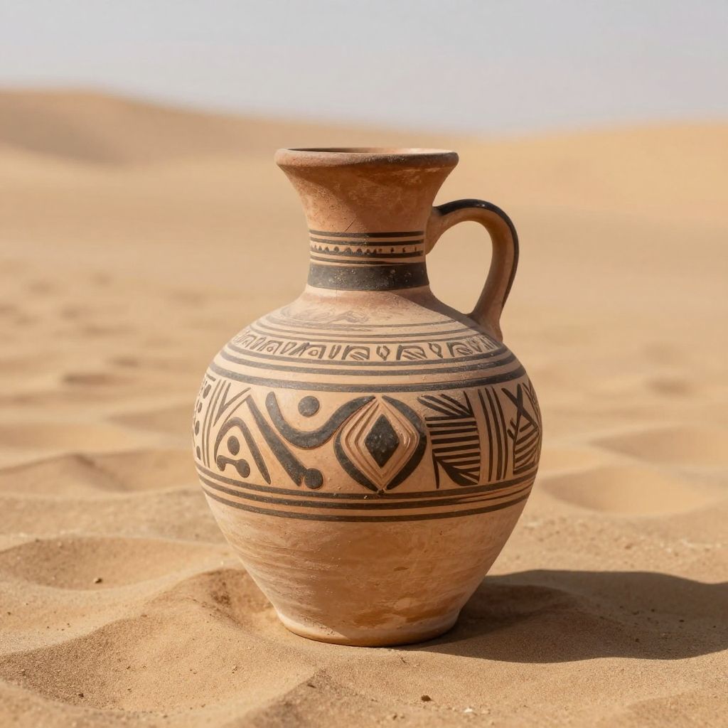 Ancient ceramic garafe, adorned with tribal patterns, placed in a desert setting with warm earth tones, encapsulating historical essence in realistic style