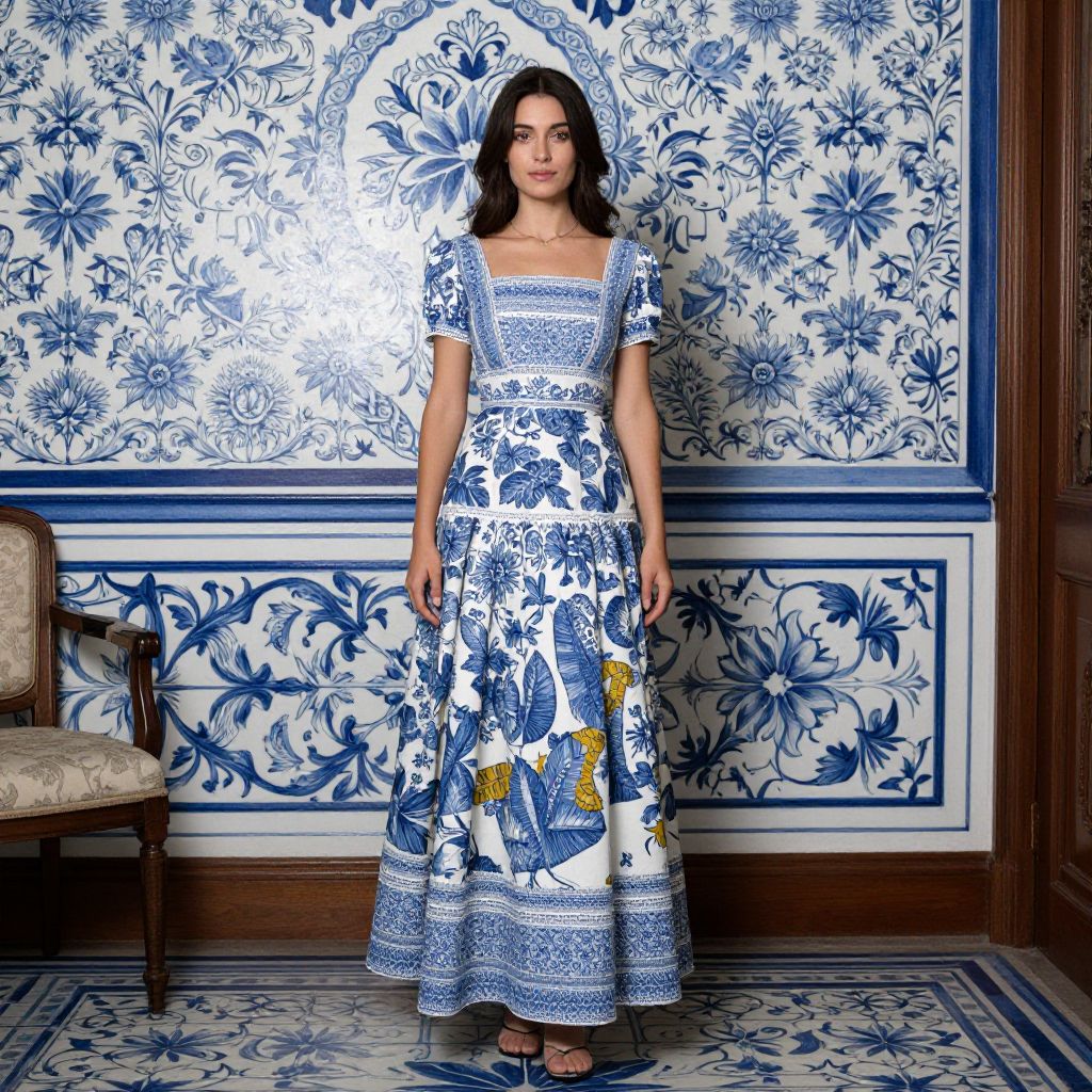 Photograph of a young woman with fair skin and dark brown, wavy hair standing against a blue and white floral wallpaper. She wears a full-length, white dress with blue and yellow floral patterns, short sleeves, and a square neckline. The dress has a fitted bodice and a flared skirt with blue lace trim. She stands in front of a wooden-framed chair with a cream, patterned fabric seat on the left. The floor has a matching blue and white floral tile design. The overall style is elegant and traditional.