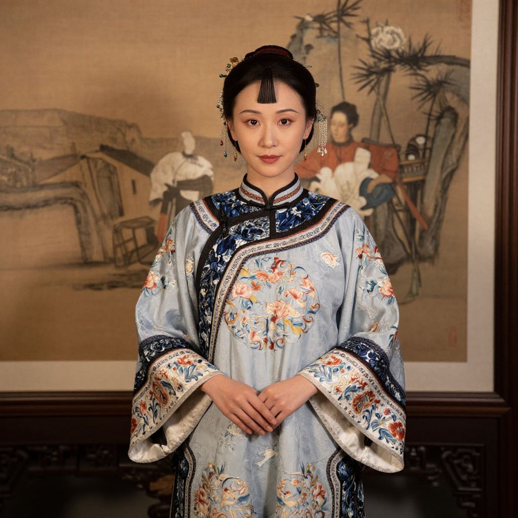 Photograph of a young Asian woman with fair skin and black hair styled in an intricate updo with a small hairpin. She wears a traditional, light blue silk kimono adorned with colorful floral patterns and navy blue trim. She stands in front of a framed, detailed Asian painting depicting a traditional scene with people and bamboo. Her hands rest gently in front of her, and she looks directly at the camera with a calm expression. The background features a wooden frame and a patterned carpet. The image has a warm, slightly sepia tone.