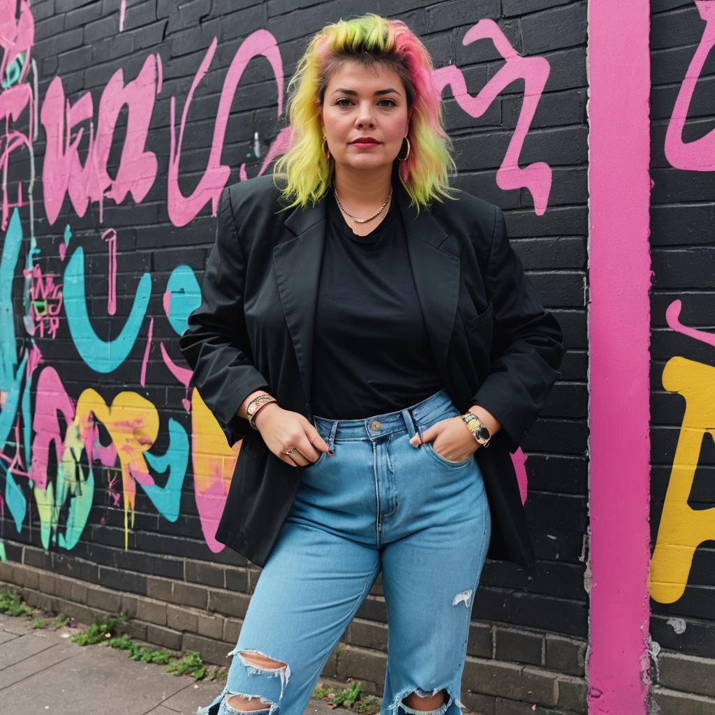 Photo of a Curvy woman, Mullet, 80s theme outfit, neon colors with an oversized Black blazer, shoulder pads, acid-wash ripped jeans, vibrant graphic tees, high-top sneakers, retro accessories, urban street, lomography style