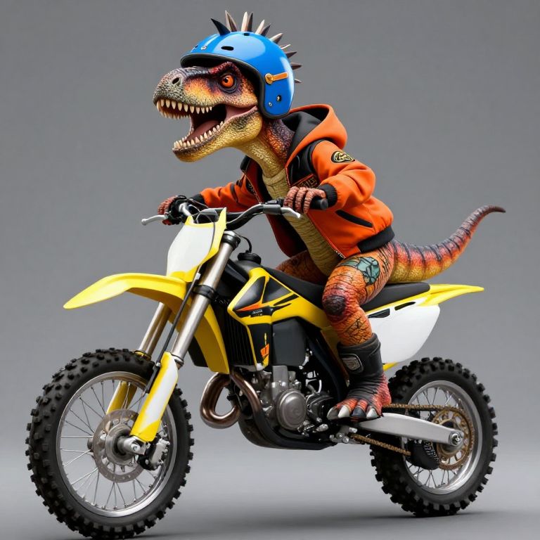 In this dynamic and vivid image, a teenage punk velociraptor, adorned with a blue helmet and a vibrant orange and black jacket, confidently sits atop a rugged dirtbike. The creature's fierce expression is accentuated by its sharp teeth and intense gaze, while its body is covered in tattoos, adding to its rebellious persona. The dirtbike, painted in shades of yellow and black, is equipped with a large front wheel and a sleek seat, positioned in the foreground. The background is a muted gray, allowing the vivid colors of the velociraptor and the bike to stand out prominently. The overall composition captures a sense of motion and energy, with the velociraptor and the bike appearing to be in a state of readiness for an adventurous ride.