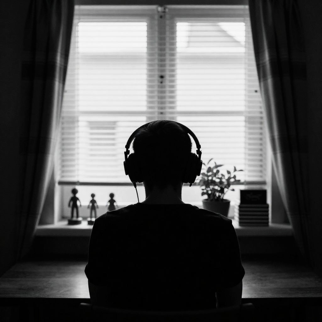 Black-and-white photograph. Two people inside a jail cell. One person stands, facing a seated person. Cell has metal bars. Standing person has short hair, casual shirt. Seated person has short hair, wearing a light shirt. Both faces not visible. Reflection on glass in foreground. Wooden table between them.