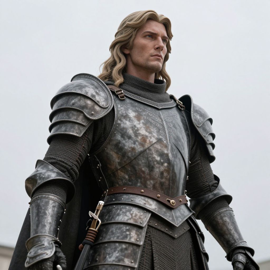 Photograph of a tall, blond-haired man in medieval, weathered silver armor with a serious expression, standing against a cloudy sky.