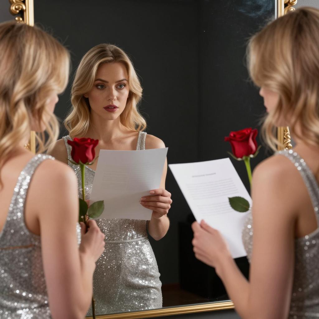 Woman in red sweater with rose embroidery, blonde hair, holding black object, foreground. Background: blurred wedding scene, bride in white dress, groom in black suit, other couple in white attire, wooden floor, tall windows.