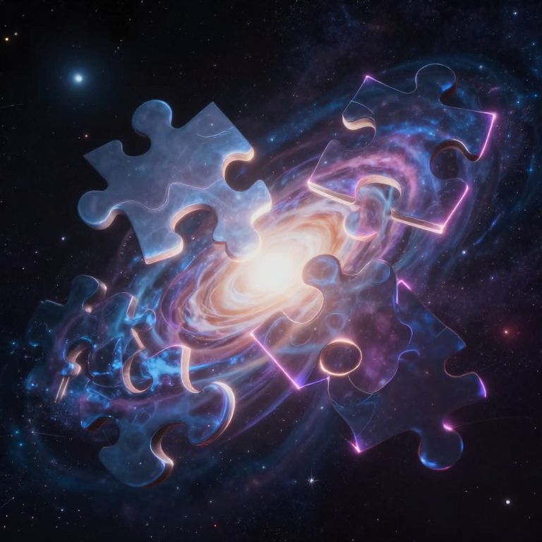Giant puzzle pieces, rendered in a digital art style with dramatic lighting, drift through a cosmic expanse, their edges glowing as they merge and split galaxies, symbolizing the dynamic interplay between connection and separation in the universe.