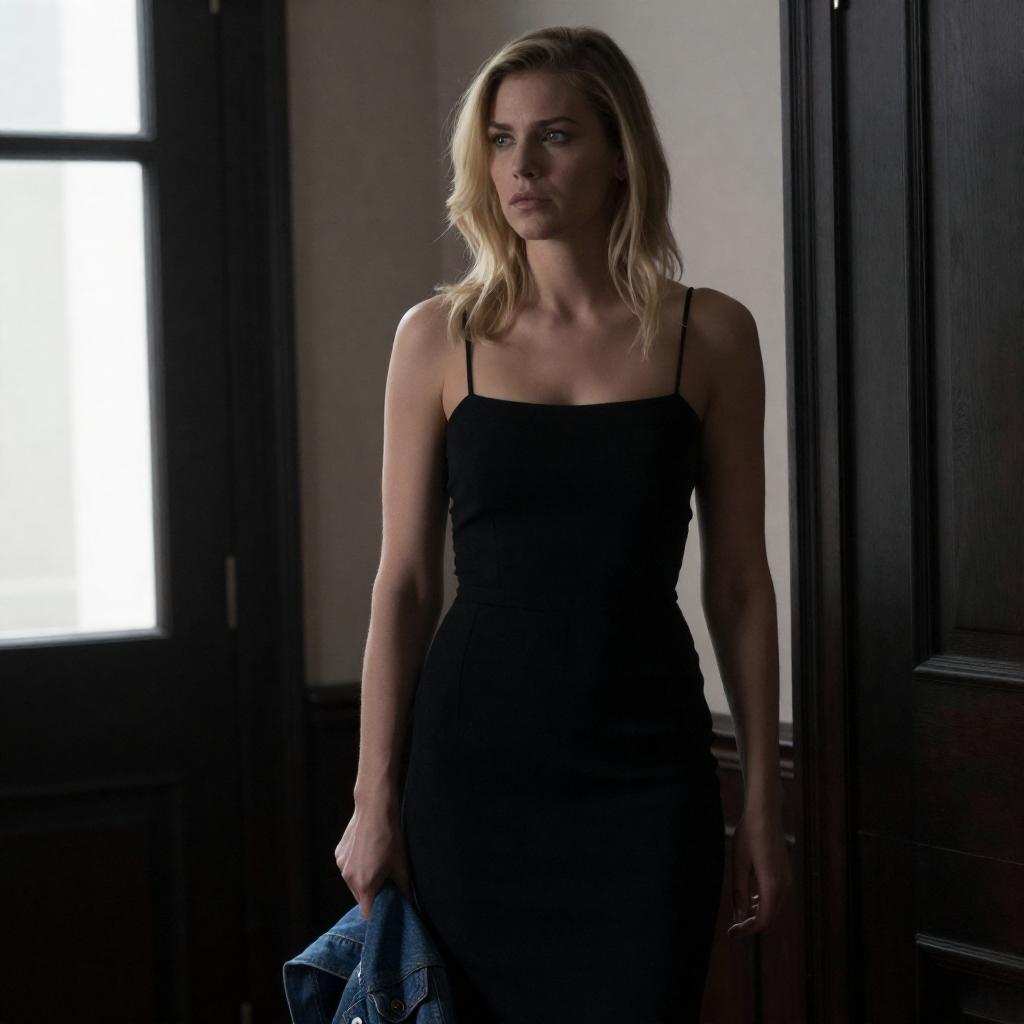 Photograph of a blonde woman with fair skin and medium-sized breasts, leaning forward through ornate black metal bars. She wears a black strapless top, her expression is intense and slightly mischievous. The background is dark and blurred, emphasizing her presence and the bars in the foreground.