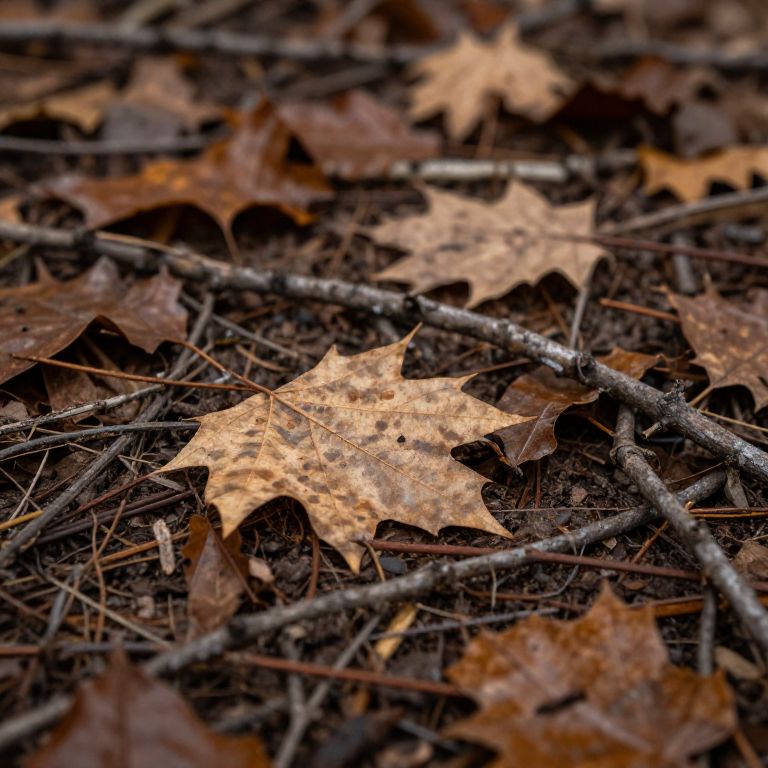 Leafless forest floor covered in dry fallen leaves, intricate textures with twigs and dirt, soft overcast lighting, moody autumn ambiance, macro perspective, hyper-realistic nature scene with rich earthy colors.