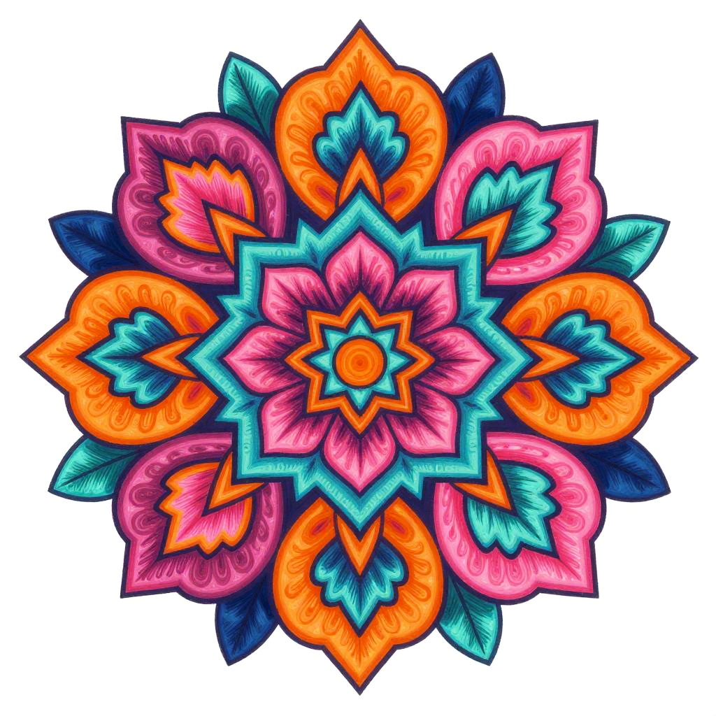Mexican flower design lush and ornate, intricate natural petals combined with geometric shapes, bright contrasting colors like orange, pink, turquoise, hand-drawn folk art aesthetic