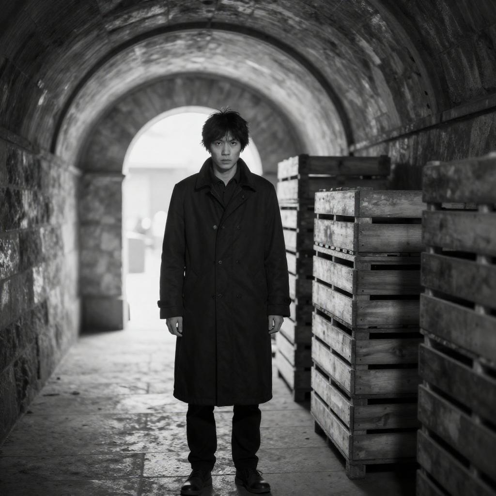 Black-and-white photograph of a person in a long, dark coat standing in a stone, arched tunnel. Stacks of wooden crates are on the right. Bright light from the tunnel entrance. One person, intense expression.