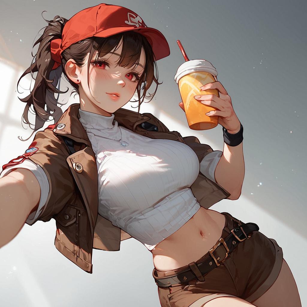 Score_9, score_8_up, score_7_up, score_6_up, score_5_up, score_4_up, holding cup, looking at viewer, parted lips, selfie, smile, vfio germi, glasses, round eyewear, baseball cap, wristband, brown jacket, cropped jacket, sleeveless jacket, midriff, open jacket, white tank top, brown shorts, short shorts, kasamoto eri, bandana, crop top, vest, navel, belt